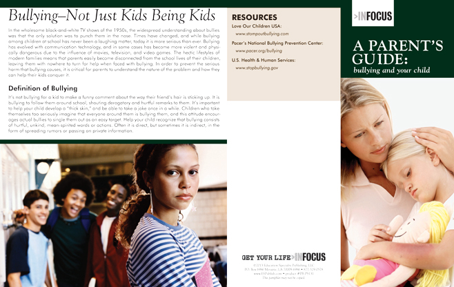 The “InFocus: A Parent’s Guide: Bullying and Your Child” information pamphlet will give parents the tools they need to effectively communicate with their children about bullying. By being attentive to your child and keeping the lines of communication open, you can minimize bullying’s negative effects. In order to prevent the serious harm that bullying causes, it is critical for parents to understand the nature of the problem and how they can help their kids conquer it.