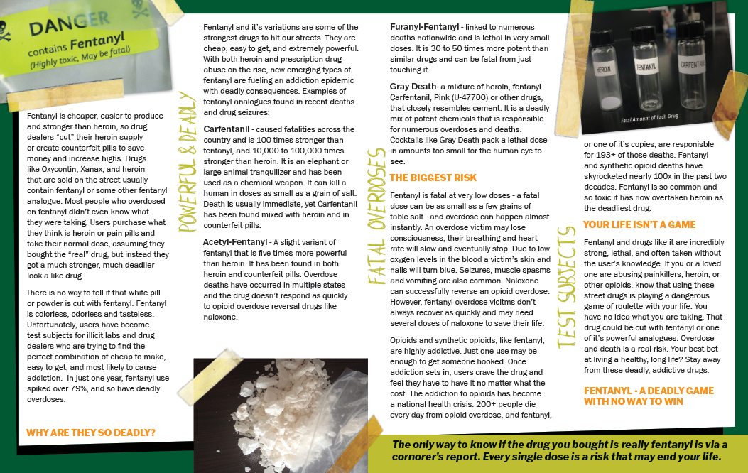 The educational brochure provides examples of fentanyl analogues plus the dangers of each one. Carfentanil, Furanyl Fentanyl, Acetyl Fentanyl and Gray Death have also been found laced in heroin. With different new drugs, comes new dangerous side effects and more risks of overdose. Fentanyl is the number one cause of drug overdose deaths, and the first drug to ever surpass heroin.
