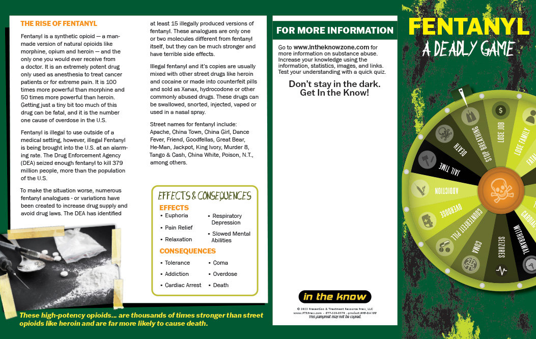 The In the Know: Fentanyl – A Deadly Game pamphlet gives a complete overview of fentanyl and the numerous analogues that are appearing on streets. The United States is in the midst of an opioid epidemic, causing mass overdoses and deaths. Overdose with Fentanyl is very quick and deadly. As a result, it’s causing overdoses and death across the country. This handout outlines the dangers faced by individuals who are using stronger synthetic opioids like fentanyl without even knowing what they are taking. Consequently, it is commonly found mixed in with heroin, counterfeit opioids and other drugs.