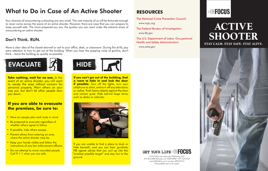 The brochure begins by advising viewers: Don’t Think – Run. It lets readers know that their best defense is to evacuate the area and seek safety by running and hiding, encouraging viewers to call 9-1-1 only after they have reached safety. If the viewer cannot get out of the building, find a room to hide in and lock the door if possible. Turn off the lights, silent mobile devices, radios, and any other sources of noise. Push heavy objects against the door and remain quiet. Hide behind large items, such as desks or cabinets.