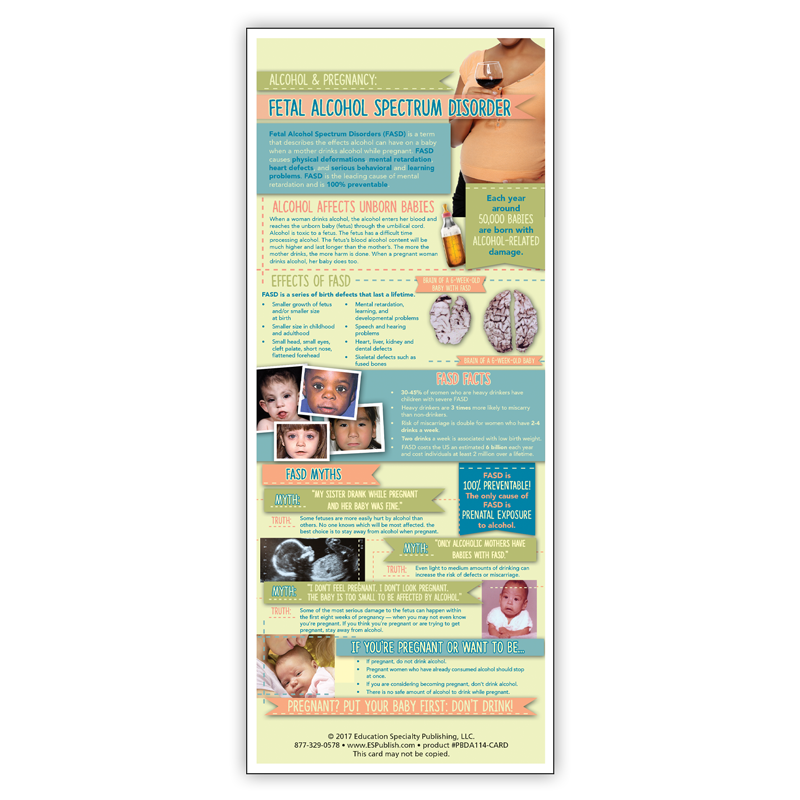The Alcohol and Pregnancy: Fetal Alcohol Spectrum Disorder information card gives a complete overview of the causes of fetal alcohol spectrum disorder (FASD). The card explains that FASD causes physical deformations, mental retardation, heart defects, and serious behavioral and learning problems. FASD is the leading cause of mental retardation and is 100% preventable.