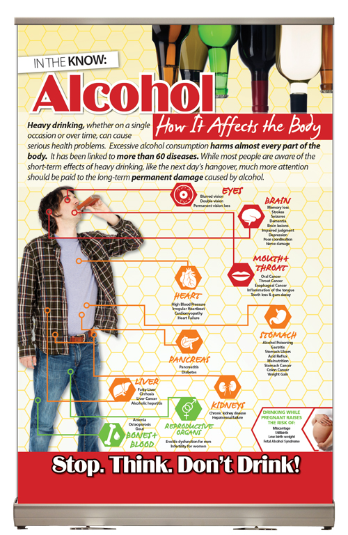 This retractable banner focuses on how alcohol negatively affects your health and the body. The display begins with an explanation that occasional, heavy use (binge drinking) or consistent long-term drinking can lead to serious health problems.