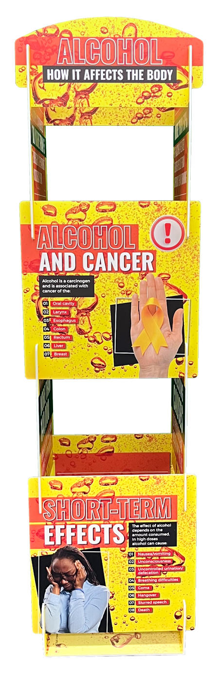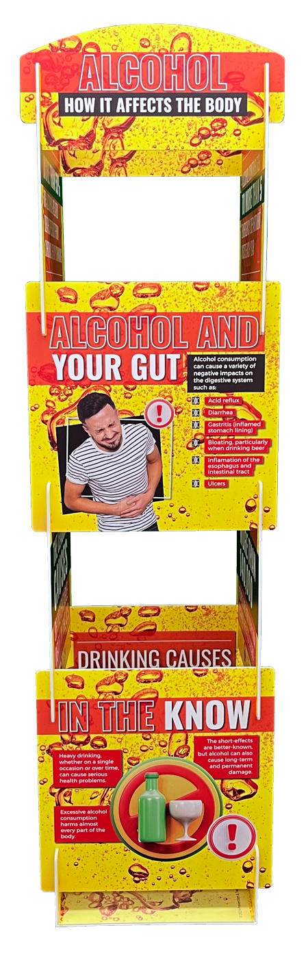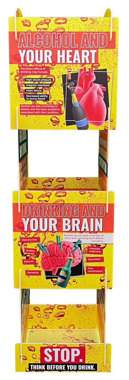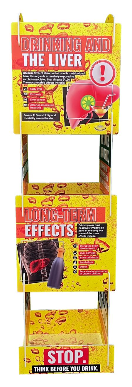 Raise awareness at your next event with the Alcohol: How It Affects the Body Tabletop Info Tower. From liver damage to impaired brain function, this freestanding display is specifically designed to break down the physical and mental toll alcohol can take, providing an engaging, approachable way to spark important conversations about responsible choices.