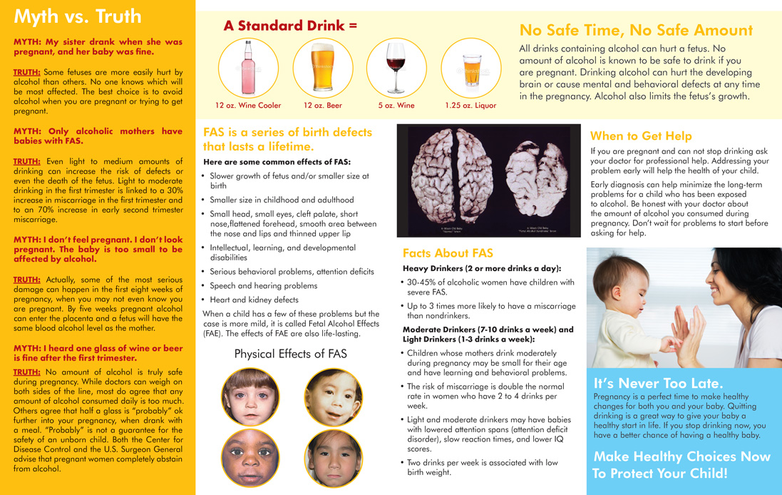 The Alcohol and Pregnancy: Fetal Alcohol Spectrum Disorder Pamphlet gives a complete overview of the causes of fetal alcohol spectrum disorder (FASD). The brochure explains that FASD causes physical deformations, mental retardation, heart defects, and serious behavioral and learning problems. FASD is the leading cause of mental retardation and is 100% preventable.