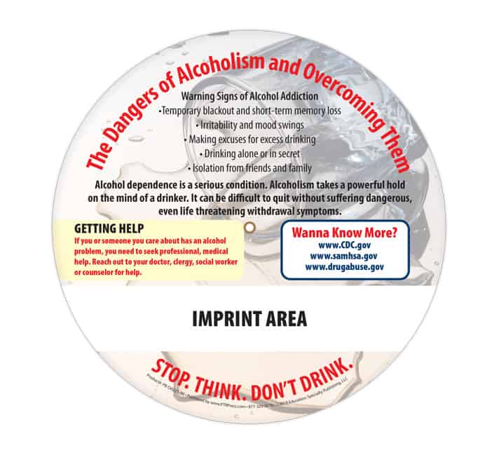 Flip it over and the back of the Info Wheel provides information about alcoholism and how to overcoming it. It also includes warning signs of alcohol addiction and offers advice on how to seek professional help. What’s more, we offer FREE Personalization! Add your organization’s name, logo, and/or custom message to leave a lasting impression.