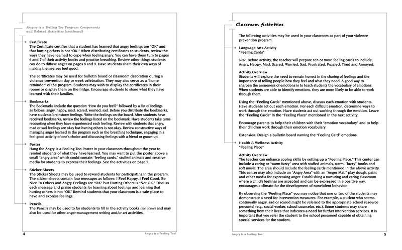 This teaching guide assists in developing non-violent and nurturing behavior through language arts, visual arts, and social studies. It provides educators with a page-by-page break down of the Angry is a Feeling Too! activity book. The guide also includes suggested classroom activities and discussion points that will help to ensure the information is retained.