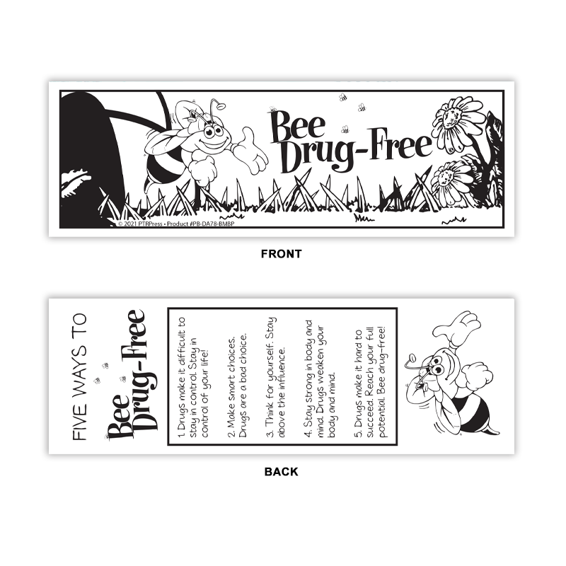 The front features our fun, themed “Bee” illustration that gives them a full coloring area that lets their imagination soar. In addition, the back of these adorable bookmarks includes a continuation of the artwork found on the front as well as five tips on how to say no to drugs.
