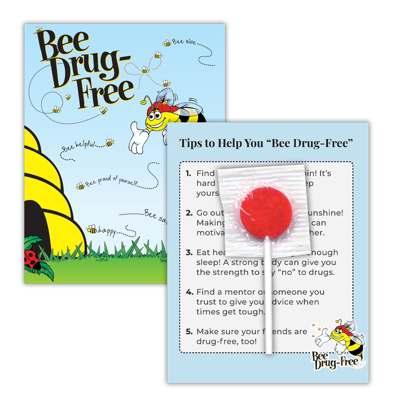 Attached to the card is a tasty cherry flavored lollipop to reward kids for committing to bee drug-free. This sweet treat ensures that children walk away from your red ribbon celebration or drug prevention program with a smile on their face.