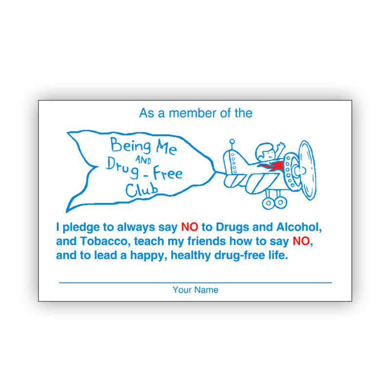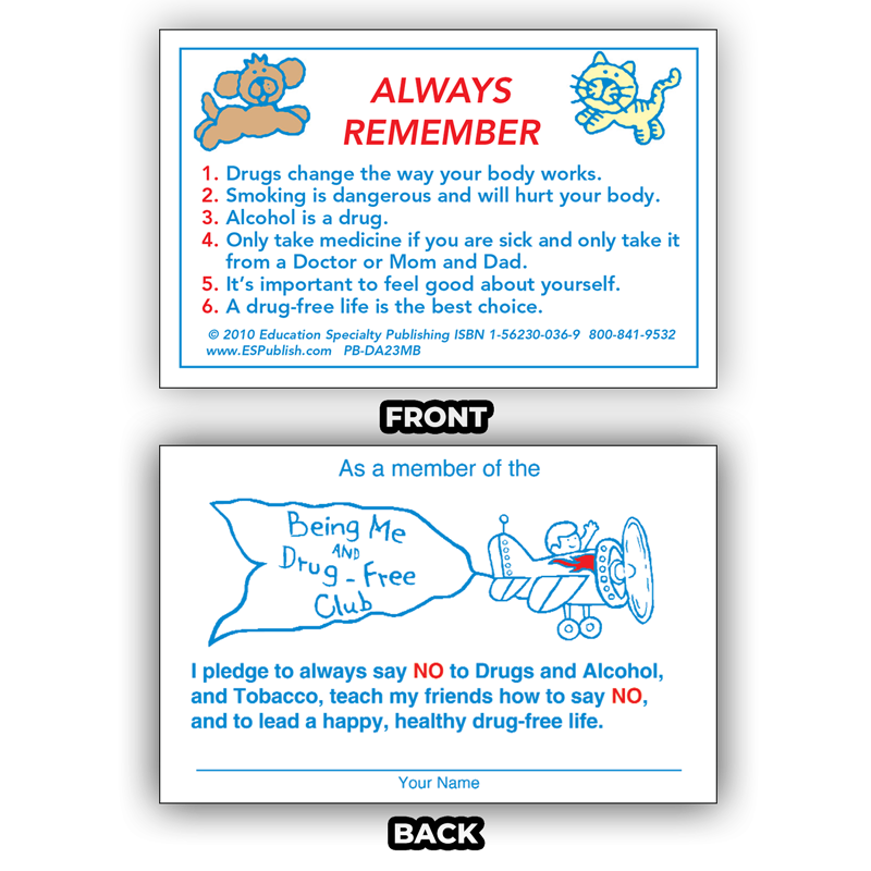 This double-sided “Being Me and Drug-Free!” Pledge Card is a great way for children to symbolize their commitment to a drug-free lifestyle. The front of this 3.5″ x 2.25″ pledge card reads: “I pledge to always say NO to Drugs and Alcohol, and Tobacco, teach my friends how to say NO, and to lead a happy, healthy drug-free life.” The back of the card reads “Always Remember” and features six facts about drugs. These cards last long after your drug prevention event has ended because they are printed on quality, heavy card stock!