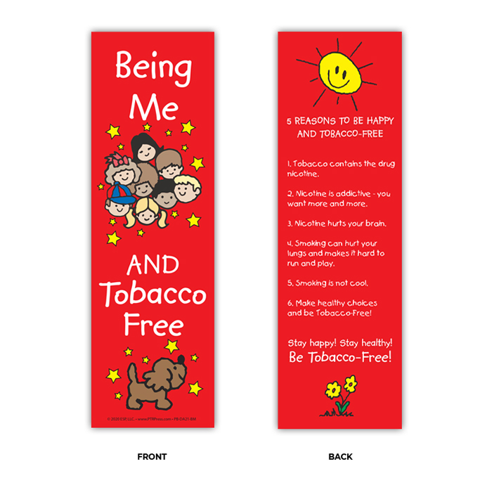 The front of the 8″ x 2.5″ bookmark features an adorable colorful design with the slogan “Being Me and Tobacco Free” that boldly stands out with big readable letters. The back features six great reasons to stay happy, stay healthy, and be tobacco free, such as: