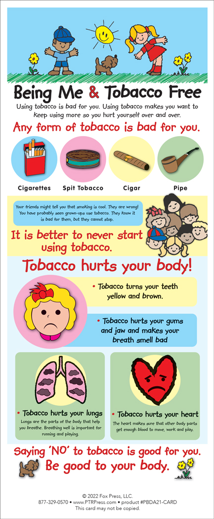 This colorful and adorable information card makes it easy for young people to understand why they should be tobacco free. This engaging card teaches children that any form of tobacco is harmful. Tobacco use leads to a variety of problems. The handout lists clear and easy to read points how tobacco hurts your body.