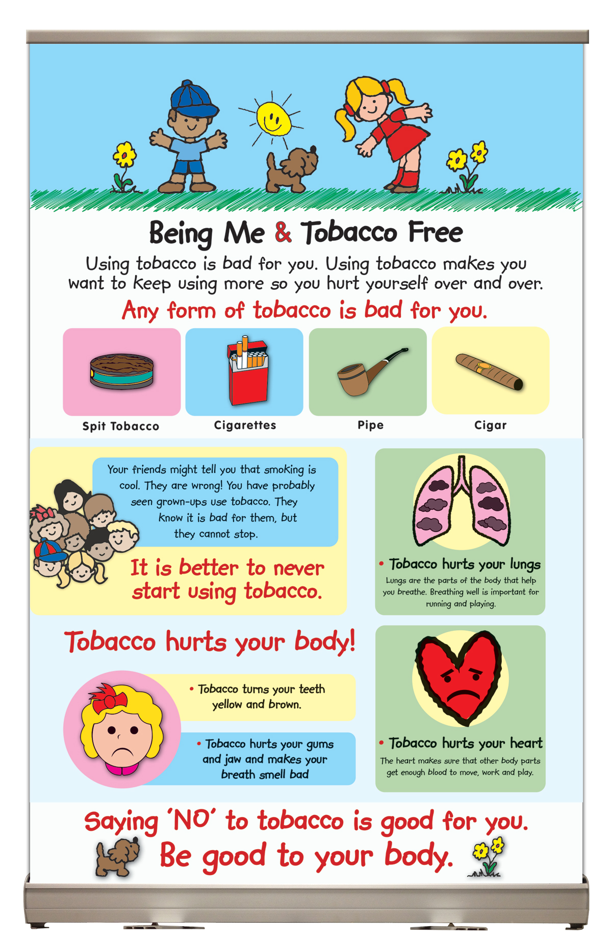 This eye catching, colorful and adorable retractable tabletop display makes it easy for young people to understand why they should be tobacco free. One of the key factors in reducing the number of smokers has to do with prevention. About 99% of smokers start by the age of 26, so prevention efforts for our youth is crucial. This engaging roll up banner teaches children that any form of tobacco is harmful and can lead to a variety of health problems. The banner lists multiple clear and easy to read points how tobacco hurts your body and the importance of being tobacco free.