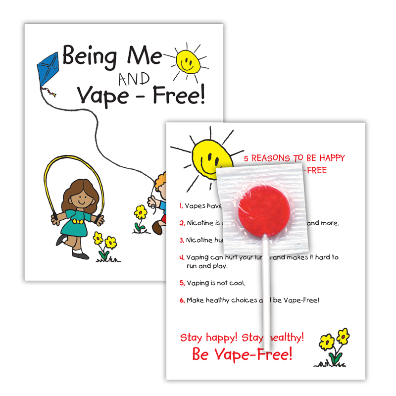 Reward children for staying nicotine free with our Being Me and Vape Free Lollipop Cards! Each 5.5″ x 4.25″ in. vape-free card printed on heavy duty card stock. The front of the card features themed artwork and the message “Being Me and Vape Free!” and the back features great prevention tips. The message together with the artwork act as a reminder to children that being vape free is a positive thing! Add your custom message and logo to get the recognition your organization deserves!