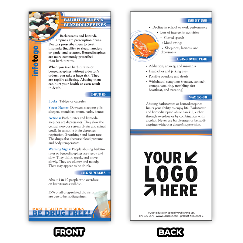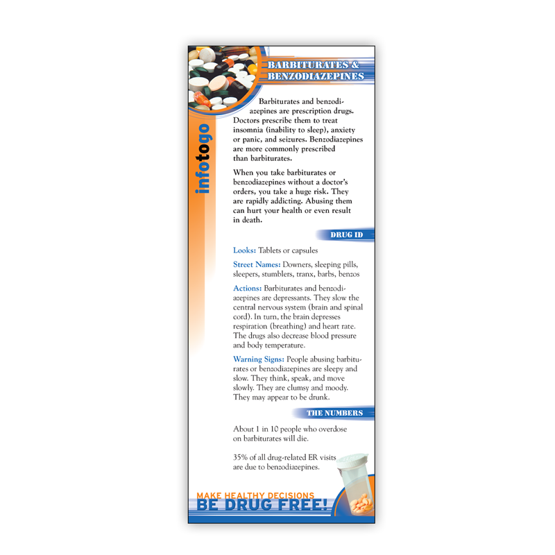 Equip your audience with essential knowledge using our Barbiturates and Benzodiazepines Rack Card. Perfect for events, these handy cards provide clear and concise information about the risks, effects, and signs of misuse of these commonly abused substances.