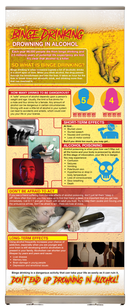 Our “Binge Drinking: Drowning in Alcohol” Retractable Banner begins by describing what binge drinking is. Binge drinking is when someone ingests a lot of alcoholic drinks in a short span of time.