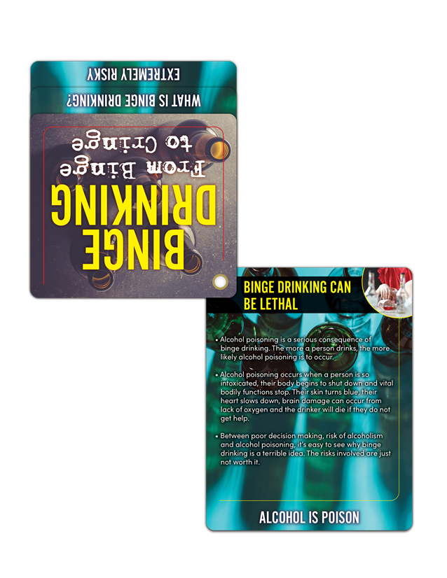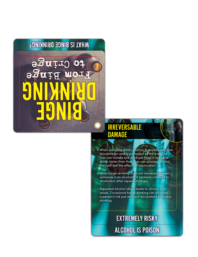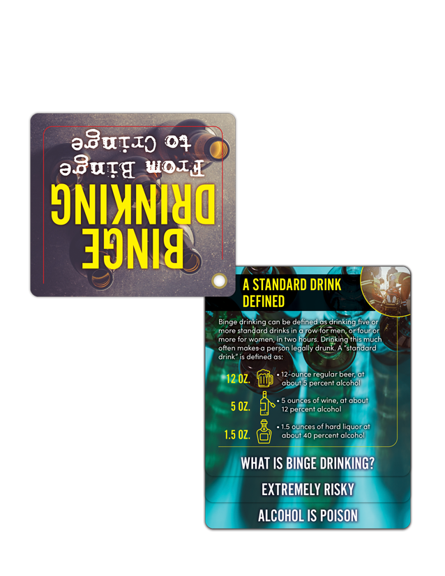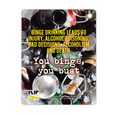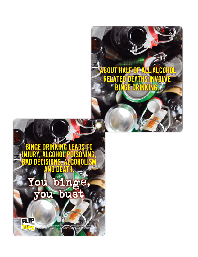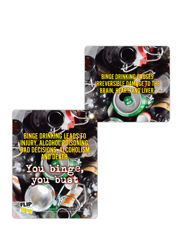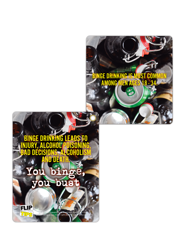 Defeat short attention spans when it comes to alcohol prevention with these Binge Drinking Flip Tips! These interactive handheld cards are packed with informative points and eye catching graphics that is sure to engage the young adult demographic. Includes only the most vital content to get the point across and keep reader’s attention. Readers don’t just read, they interact as they learn how risky binge drinking is. Prevention coordinators understand that using multiple learning styles, such as these cards, can make learning enjoyable and aid in retaining information. Small enough to take wherever you go and easy to hand out, Flip Tips are a great choice for any alcohol awareness program!