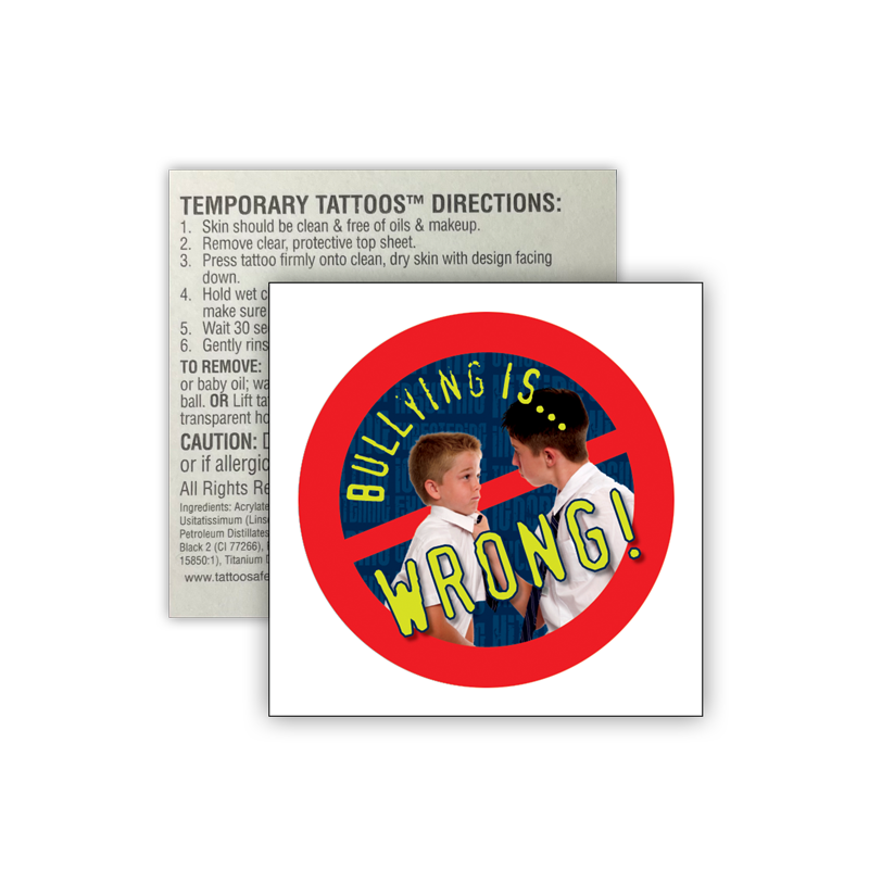 This fun, removable tattoo reinforces the message that Bullying is wrong.