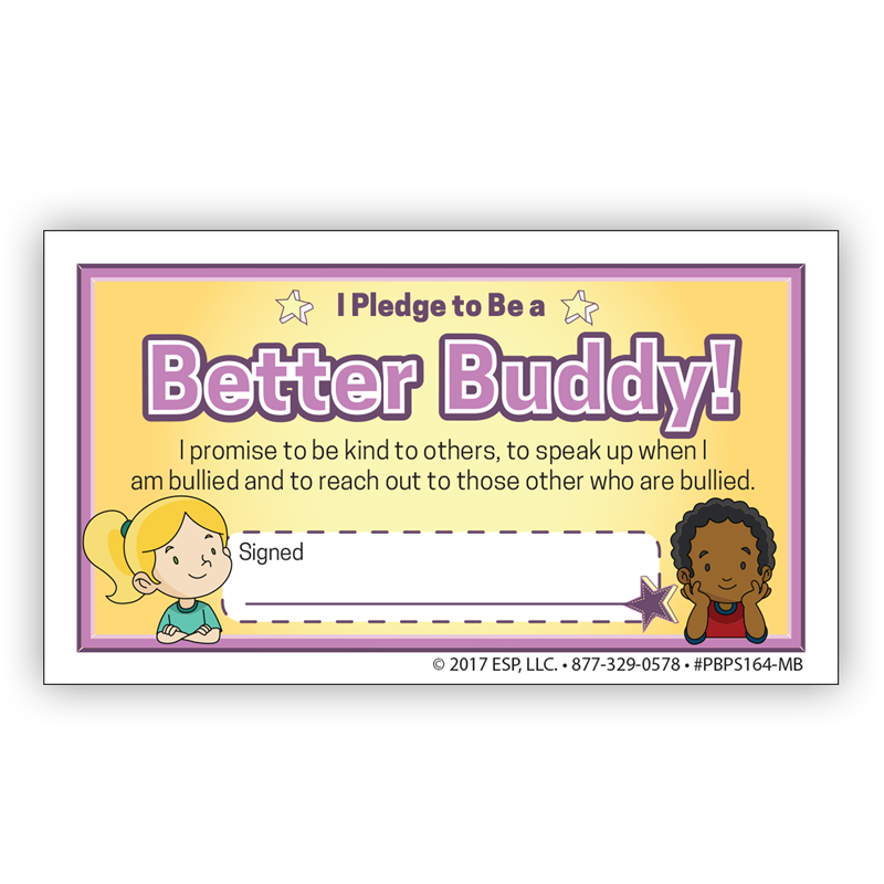 One in four students feel like the have been a victim of bullying. People who are perceived as “different” by their peers are more likely to be targets. Bullying prevention products, like our “Be a Better Buddy! Not a Bully” Pledge Cards, help children feel like they belong. Kids will love to take the Better Buddy! pledge. Get your school the tools they need to jumpstart their next anti-bullying campaign!