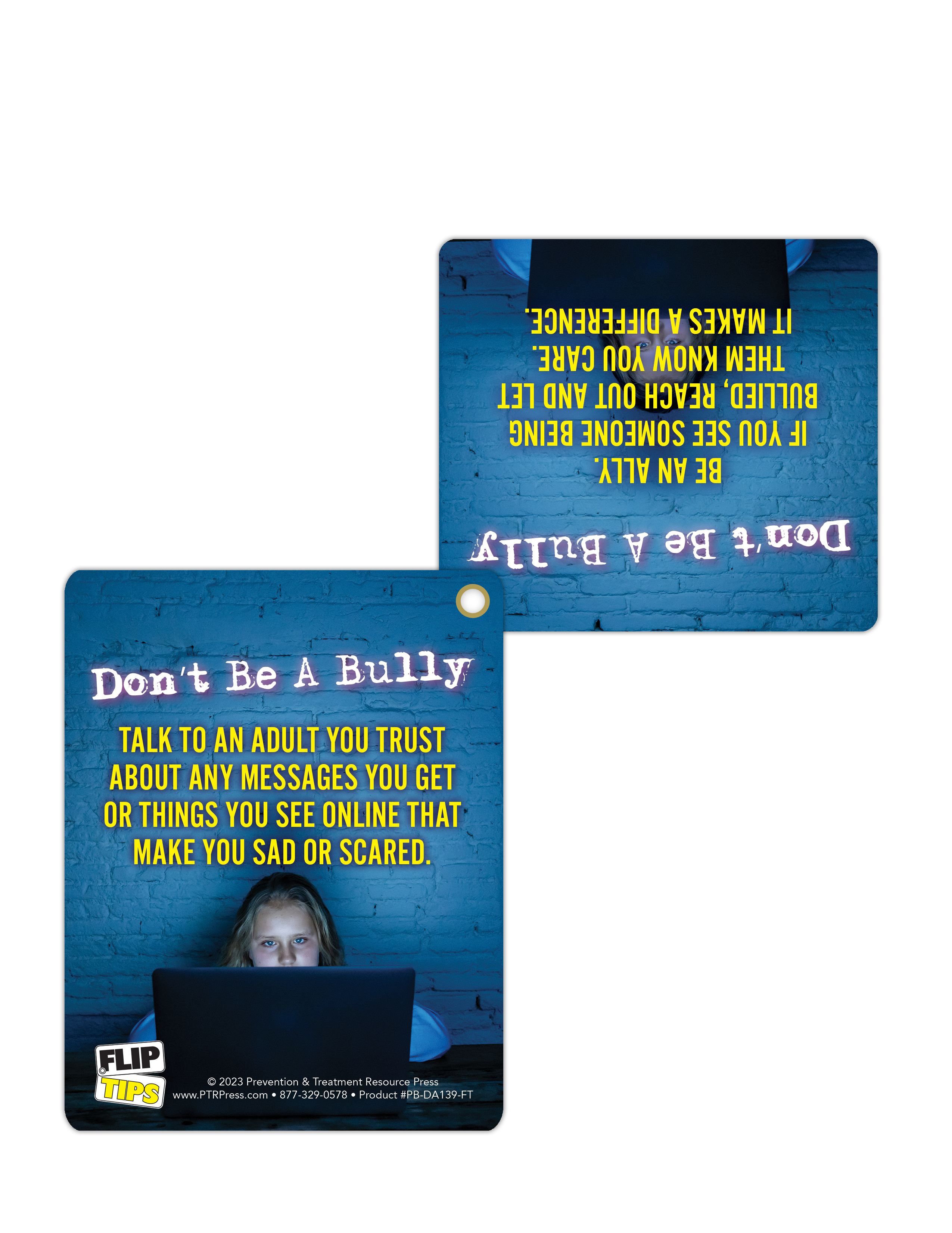 Help individuals in your community to build self confidence to “Stand up, Speak out” with these Bullying Prevention Flip Tips! It is very important that young people not only understand what bullying is, but what they can do to help prevent it. These cards contain simple tips to help students make smart choices. Small enough to take wherever you go and easy to hand out, these flip tips are a great choice for any prevention education program!
