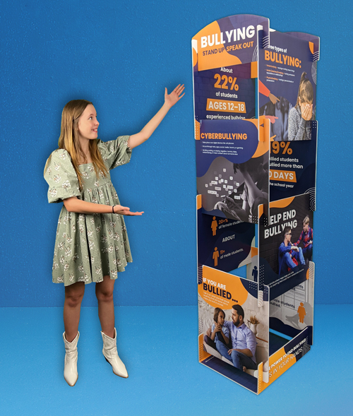 Stand Up and Speak Out with this unique and innovative Bullying Info Tower Display. This tower is a powerful tool for educators and community leaders to raise awareness about what bullying is and how to prevent it. The versatile 4-sided 360-degree viewing angle design ensures that the information is visible from all angles, making this tower a great tool for public events and gatherings. Whether it’s at a school, community centers, or health fairs, it attracts attention and starts important conversations about bullying prevention, intervention, and fosters a culture of inclusivity.