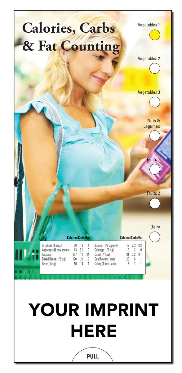This handy nutritional slide chart is perfect for counting calories, carbs and fat content. With reference to over 135 common foods, as well as a convenient fast food guide, it has never been easier to lose weight and maintain a healthy lifestyle. Interactive learning is easy with this sliding informational card. Each bullet point is augmented with interesting information provided through a clear viewing window. An ideal product for the doctors office, health departments, wellness centers and more. They’re also a great way to promote your health and nutrition campaigns.