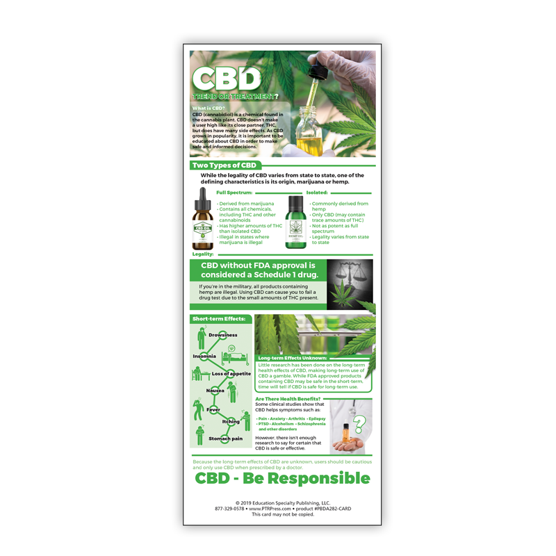 Whether you’re talking to high school students or adults, this “Cannabidiol (CBD) Trend or Treatment” information card will be a valuable resource. CBD, often hailed as a trend, can be confusing for many. CBD (cannabidiol) is a chemical found in the cannabis plant. It doesn’t make a user high like its close partner, THC, but does have many side effects. As CBD grows in popularity, it is important to be educated about it in order to make safe and informed decisions.