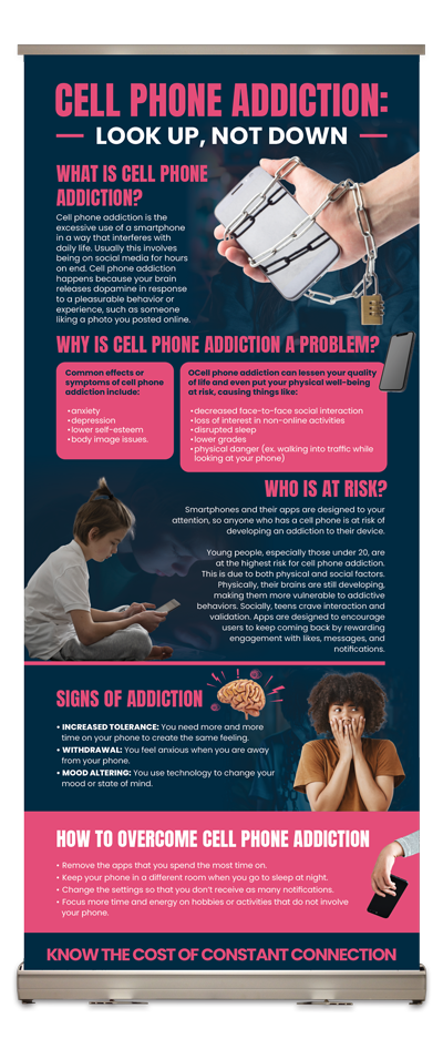 From endless scrolling to social media overload, this cell phone addiction display helps people see the bigger picture—and encourages them to unplug, refocus, and reconnect with real life. So make an impact at your next event with a ready-to-use, engaging, and informative resource that sparks important conversations about tech use and well-being. Order today!