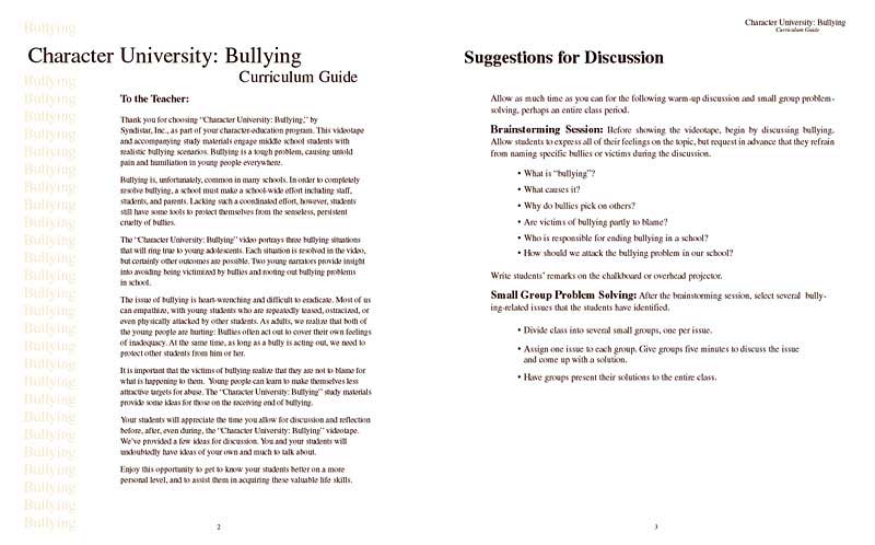 The Bullying curriculum guide explains how to use its coordinating video and student workbook. It includes ideas for discussion, problem solving activities, and writing exercises to conduct before and after viewing. The guide also contains answers for the recall-and-analysis questions and other activities found in the student workbook. The information presented is a starting point for discussions on bullying and the emotional and physical harm caused to the victim and the bully. The Character University: Bullying program is perfect to enhance any character education program.