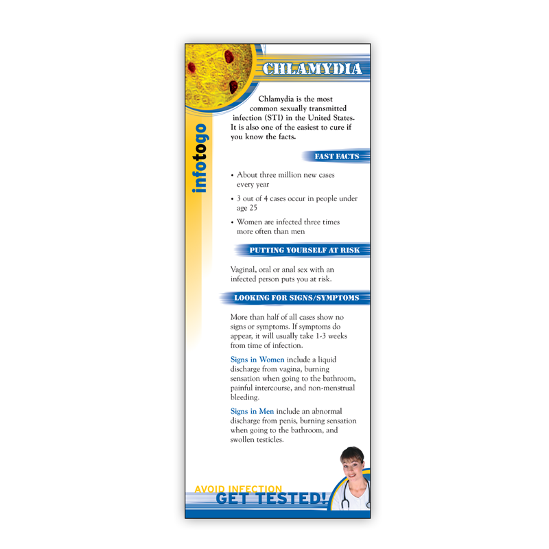 Readers of this concise, double sided rack card learn that chlamydia is the most common sexually transmitted disease in the United States. Fortunately, it is one of the easiest to cure. Chlamydia afflicts some three million Americans a year. Moreover, the majority occurring in women under 25. Most people infected with chlamydia have no symptoms. When symptoms occur, they may not appear until weeks later. So most people do not seek treatment or take measures to prevent its further spread. It warns that untreated chlamydia can cause subsequent inflammatory conditions in the genitals of both sexes. It can cause serious, permanent damage to a woman’s reproductive system. Moreover, it is capable of rendering both victims sterile.