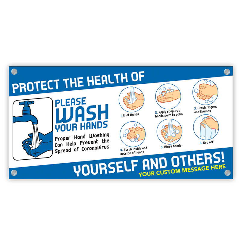 This hand hygiene banner helps remind adults to wash their hands to help reduce the spread of germs and diseases. Proper handing washing can also help stop the spread of the coronavirus! This large banner is made with durable, high quality vinyl that is UV-resistant and water resistant. Which makes it perfect for repeated use. The banner also includes reinforced grommets, making it suitable for indoor or outdoor use.