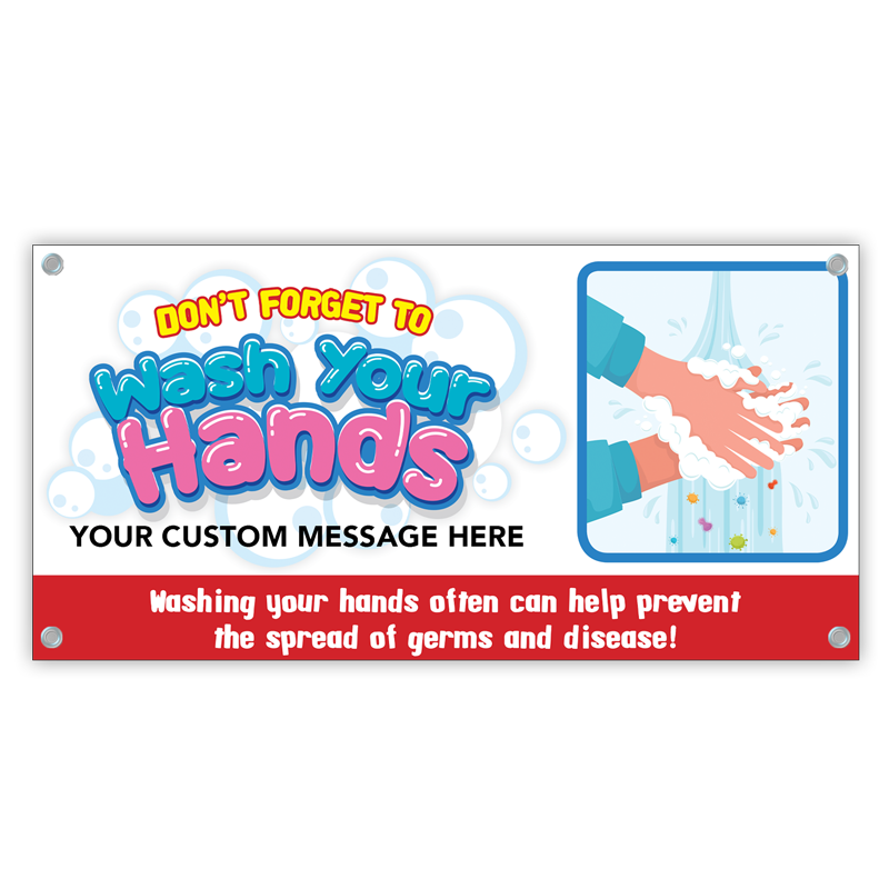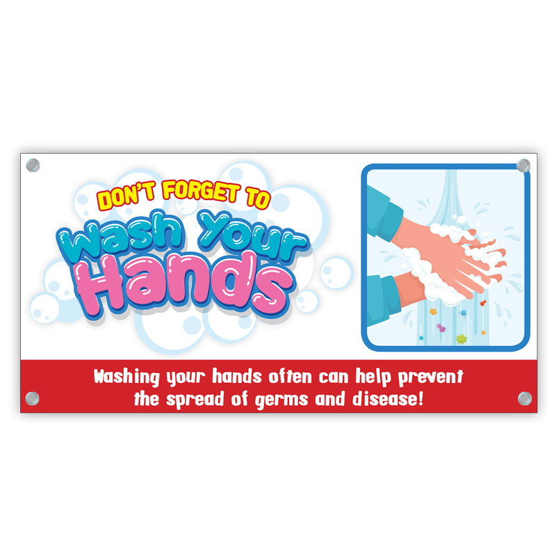 This eye catching Hand Washing Banner helps remind children to properly wash their hands. Washing your hands often can help prevent the spread of germs and disease. This large banner is made with durable, high quality vinyl that is UV-resistant and water resistant. Which makes it perfect for repeated use. The banner also includes reinforced grommets, making it suitable for indoor or outdoor use. Banners are extremely useful hand washing reminders for high traffic areas. Whether it’s used in tandem with other hand washing products in this line or used all by itself, it’s sure to get some attention. Great for schools, auditoriums, gymnasiums, classrooms, hallways, and even the exterior of your department.