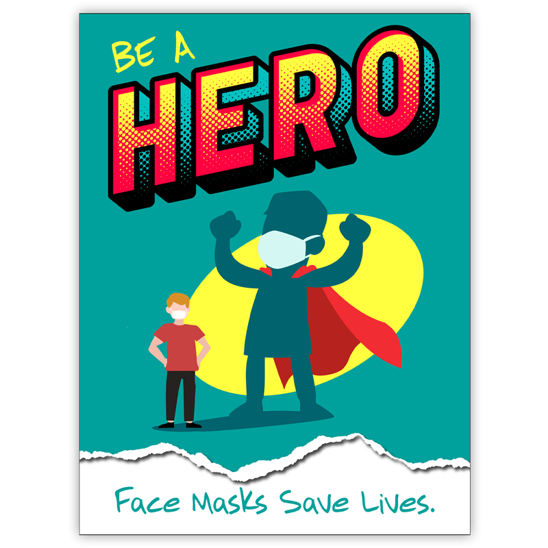 This COVID-19: Wear Face Masks Poster reminds children to be a hero and wearing face masks save lives. Wearing a face mask in public has been proven to slow the spread of the coronavirus.