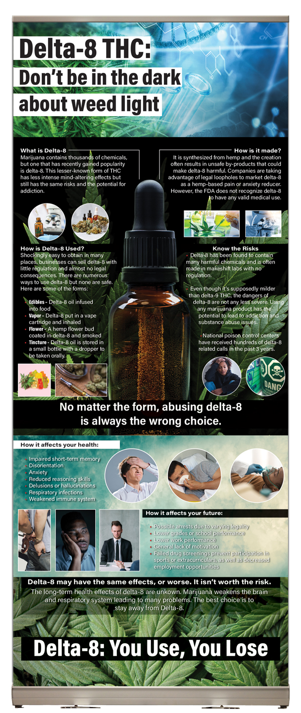 Whether you are talking to students or adults, this Delta 8 THC retractable display will be a valuable resource. Companies are taking advantage of legal loopholes to market delta 8 as a hemp based pain or anxiety reducer. However, the FDA does not recognize delta 8 to have any valid medical use. As this item grows in popularity, it is important to be educated about it in order to make safe and informed decisions.