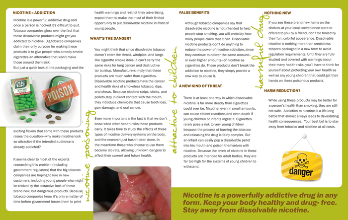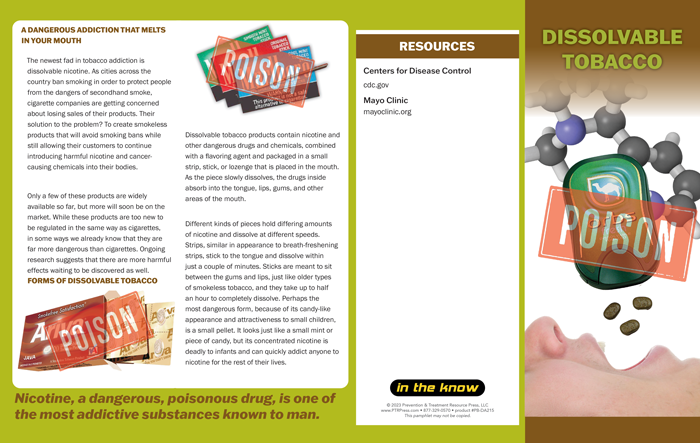 Use them as a starting point to discuss the dangers of tobacco use, the unique problems associated with dissolvable products, and the importance of creating a tobacco-free environment for everyone. Armed with the knowledge from these pamphlets, individuals gain the power to make informed decisions about this poisonous drug.