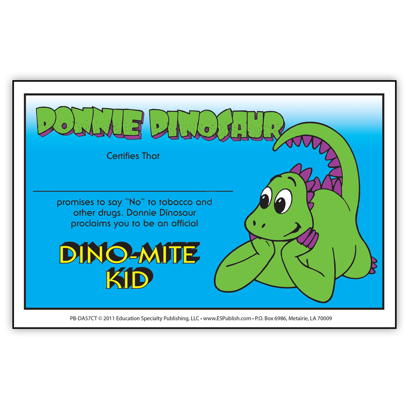 Children will feel more committed to saying “No” to tobacco and other drugs when you give them these Donnie Dinosaur’s Dino-Mite Kid certificate that proclaim a promise to say “No” to tobacco and other drugs. Drug prevention for kids has never been easier with the help of Donnie Dinosaur and Prevention and Treatment Resource Press.
