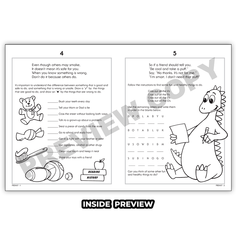 “Dino-mite Kids” enjoy fun activities as they learn why and how to avoid tobacco. This fun and educational book makes it easy to teach children about the dangers of tobacco. It includes puzzles, rhymes, games, and more that make the learning process fun, ensuring that these lessons aren’t forgotten.