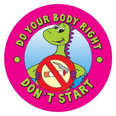 This colorful Donnie Dinosaur Tobacco Sticker bears a memorable message: Do Your Body Right. Don’t Start. This sticker reinforces Donnie Dinosaur’s important message, making it a great companion to Donnie Dinosaur’s Tobacco Trouble video and the Donnie Dinosaur Tobacco Trouble activity book! This sticker measures 2.5″ in diameter and are sold in packs of 100.
