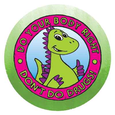 Our colorful Donnie Dinosaur’s “Do Your Body Right – Don’t Do Drugs!” Sticker teaches children that drugs negatively affect their bodies. This drug free sticker works well by itself or in conjunction with our other Donnie Dinosaur products. In addition, each sticker measures 2.5″ in diameter and can be purchased in packs of 100. The stickers also come pre-cut, making them easy to remove (no sticky residue).