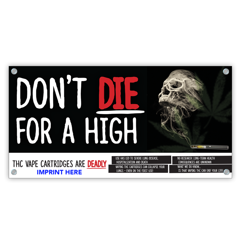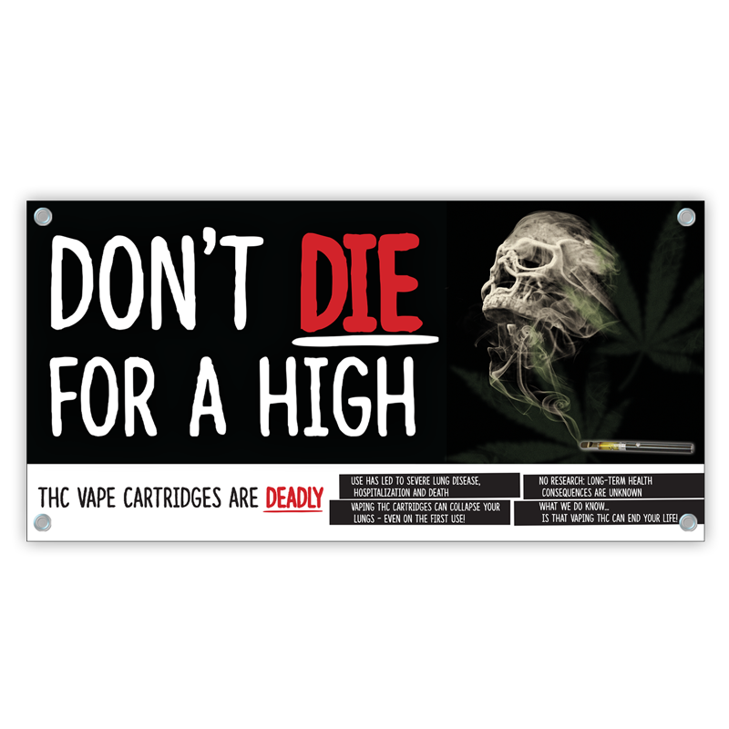 THC Vape Cartridges are DEADLY. Spread the word about the dangers of vaping THC cartridges with our “Don’t Die for a High” Banner. When you vape THC, you could be exposing your body to anything.