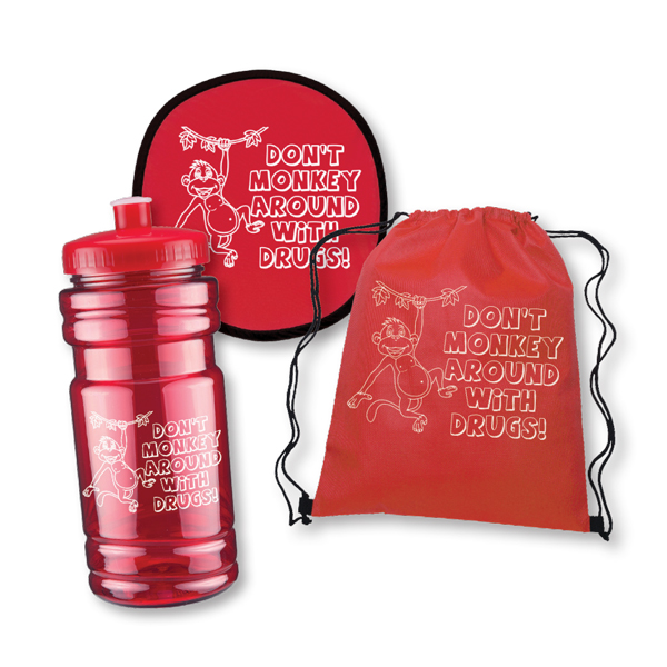 Get kids serious about a drug-free life with this engaging Red Ribbon Week Package, which includes a water bottle, drawstring bag, and nylon flyer! Our fun and playful “Don’t Monkey Around with Drugs” themed designs encourage kids to stay strong and make healthy choices.