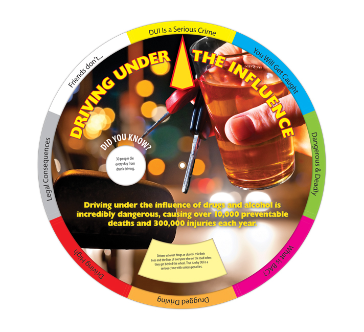 Get ready to spin, learn, and inspire change in your community with our Driving Under the Influence Information Wheels. In an era where socializing often involves alcohol, our Info Wheels are here to address drunk and drugged driving head-on. We’ve packed these wheels with insights, facts, and real talk about the dangers of drunk and drugged driving. With a simple spin, dive into the world of facts and information, turning a traditional lecture into an interactive experience.