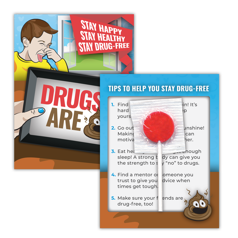Reward children for staying drug-free with our “Drugs are ?” Emoji Lollipop Cards! Each 5.5″ x 4.25″ in. card is printed on heavy duty card stock. The front of the card features themed artwork and the message “Drugs are ?.” The message and artwork visually showcases to children that drugs are nasty, smelly and just gross! Add your custom message and logo to get the recognition your organization deserves!