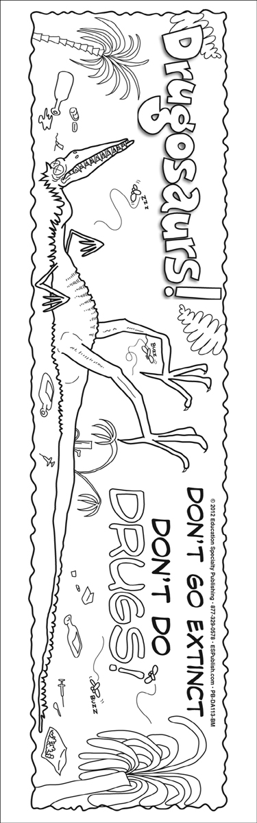 Help engage and educate kids about the dangers of drugs and alcohol with this “Drugosaurs” color me bookmark. Our primary goal is to keep our children safe and healthy. One way to achieve this is by educating them about the dangers of alcohol and drugs at an early age. This bookmark is an effective addition to a wide variety of substance abuse programs, providing a lasting reminder of the importance of staying drug free. Kids can decorate it any way they like while learning at the same time and place it in their favorite book. Then every time they see it, it’s another prevention impression. A great interactive drug prevention handout for schools, aftercare, fairs, or more!