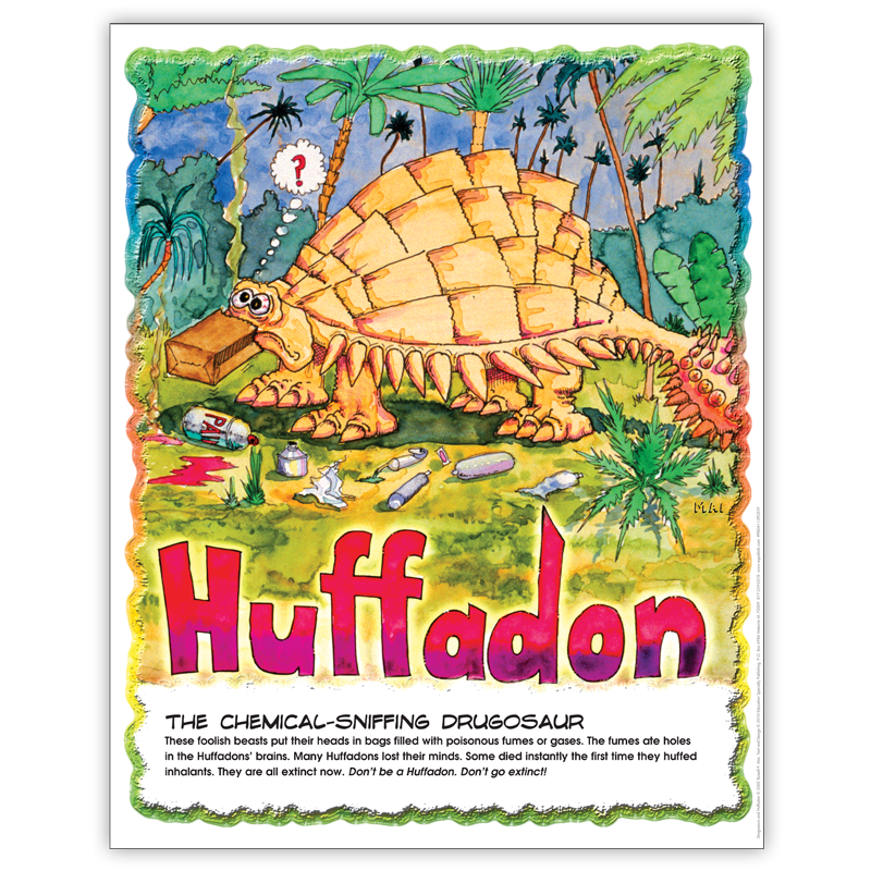 This full color poster features the Huffadon, the Drugosaur who went extinct from huffing inhalants. Kids will learn to identify the effects of the drugs that made Drugosaurs go extinct. An important lesson to learn if they are going to make the right choice and avoid using drugs. Posters are extremely useful decorations for high traffic areas so that you get your message out there. Make an impact in your community! Great for auditoriums, gymnasiums, cafeterias, classrooms, hallways, and even the exterior of your school. Customers love buying our posters for their students to sign during awareness events or during other drug prevention programs.