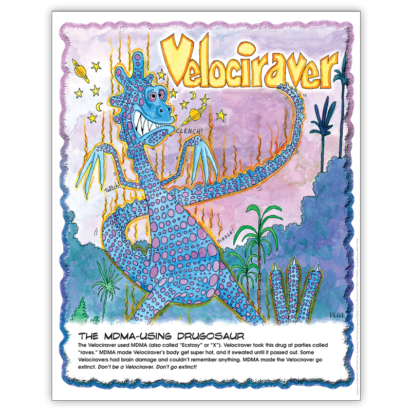 Spark imagination and promote a drug free lifestyle with this eye catching MDMA and ecstasy prevention poster. Featuring Velociraver, the Drugosaur who went extinct from MDMA and Ecstasy use. Kids will learn to identify the effects of the drugs that made Drugosaurs go extinct. An important lesson to learn if they are going to make the right choice and avoid using drugs.