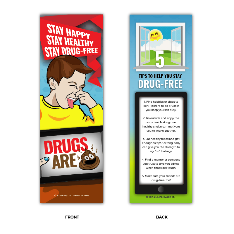 Give kids five great reasons to be happy, healthy and drug free with this double sided “Drugs are ?” Emoji Bookmark! A great handout to promote healthy habits for school events, classroom prizes, after care, fairs, and more! Printed on glossy card stock, these durable bookmarks are made to last. This adorable bookmark is a great way to promote substance abuse prevention to a younger age group, helping them to make informed decisions when they are older. What’s more, these bookmarks are cost effective and easy to pass out!