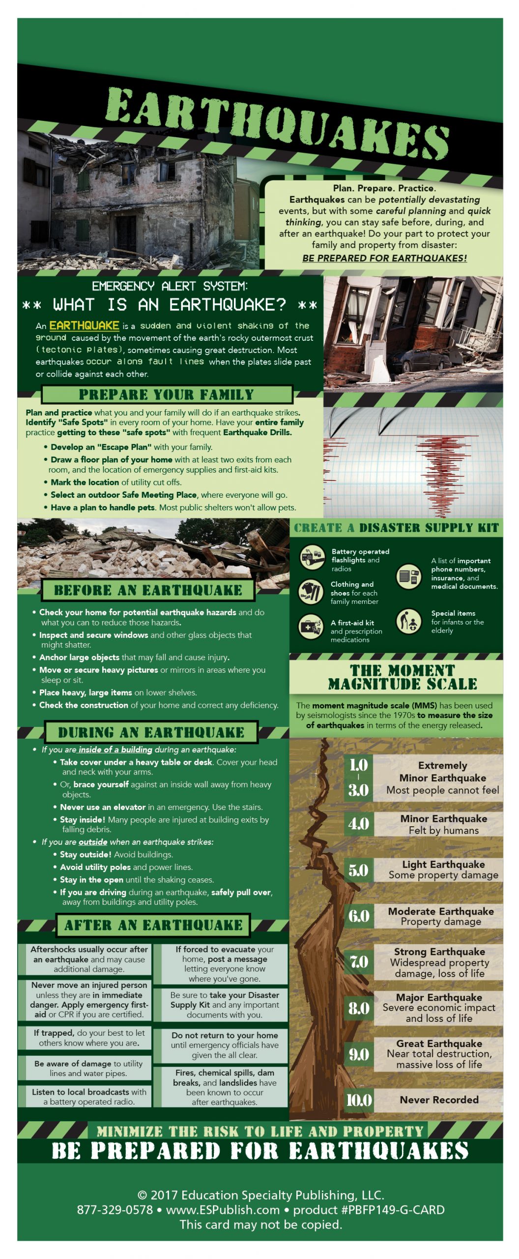 • Increased Awareness: Each card is a smaller, pocket sized version of our matching “Earthquakes” Displays. A great reminder to leave behind, reinforcing the information described in the display. They’re also great as a stand alone product that provides bulleted, easy to understand information.