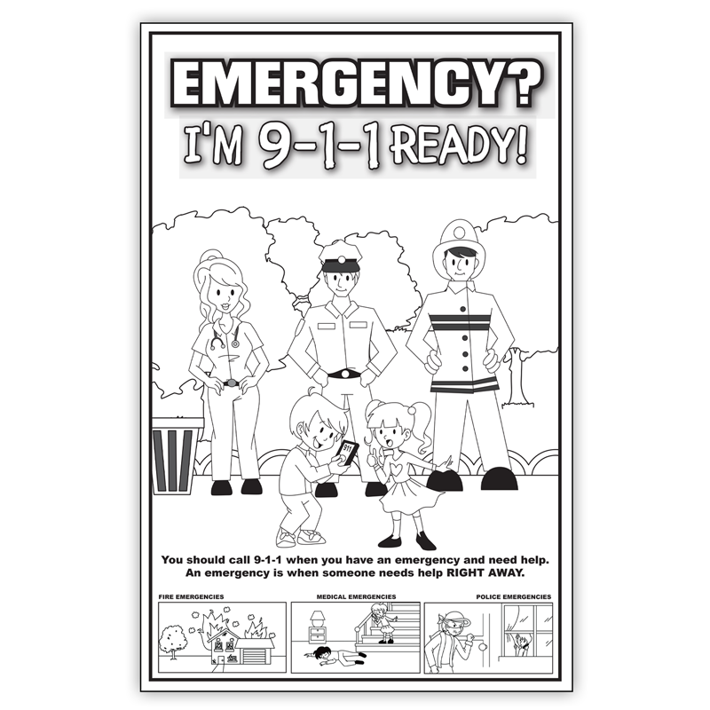 The adorable 11″ by 17″ poster is large with bold graphics perfect for coloring. At the bottom of the poster children will read important information on what an emergency is and when they should call 9-1-1. It reads: “You should call 9-1-1 when you have an emergency and need help. An emergency is when someone needs help RIGHT AWAY.”