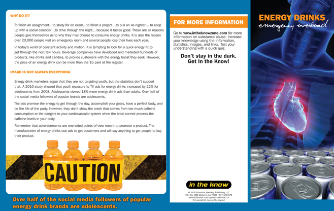 Spark the conversation on substance awareness with our In the Know: Energy Drinks, Emergency Overload Pamphlets. These pamphlet focuses on the dangers of energy drinks and caffeine consumption in excess. With explanations about how much caffeine is in energy drinks, how manufacturers hide the truth, and how dangerous levels of caffeine affect the body, this energy drink pamphlet is a great resource to educate your community about the risks of using energy drinks.