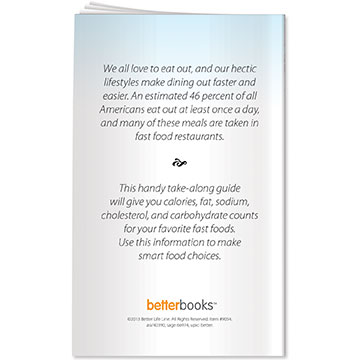Make the right choices when eating away from home with this 36-page “Fast Foods: Smart Eating Guide.” Let this book be your mission to good health. Keep track of calories, fats and carbs for all of your fast foods and drinks. Topics include how to order the correct portion, what food toppings to skip and watching what you drink. These amazing booklets will gives essential advice and helps keep your life healthier and more organized.